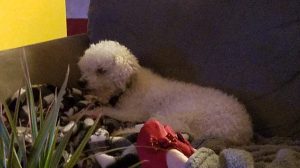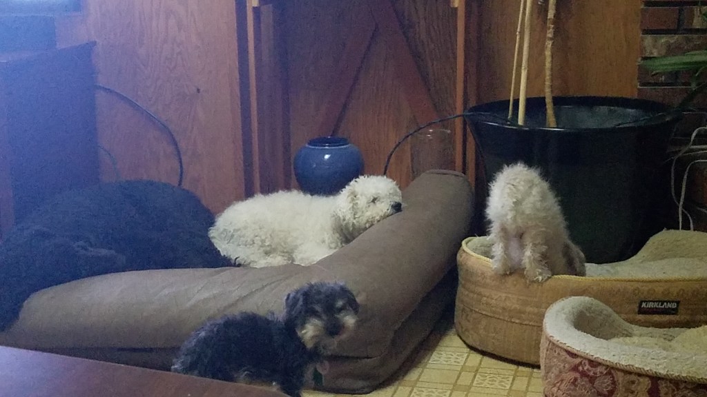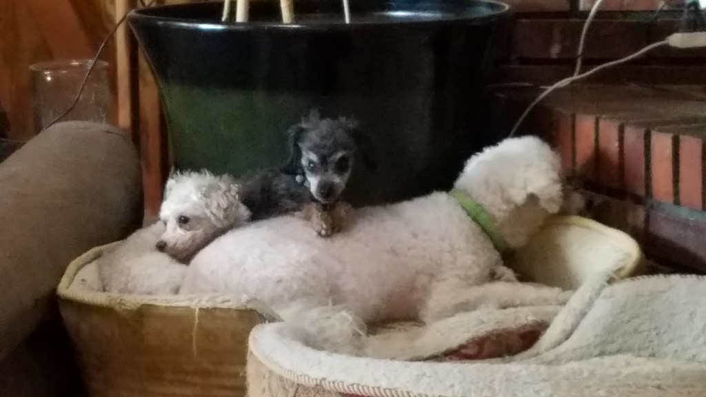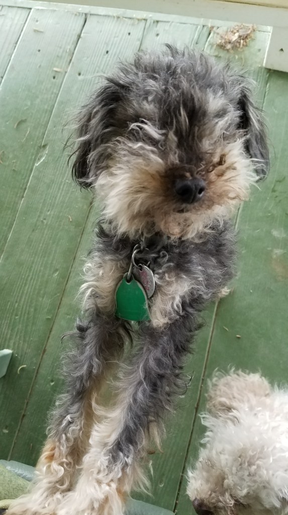 So, oldest in our pack, is my very special boy Scooby-Doo. Scooby is technically my brother’s dog, but to be honest, they’re all mine when the rubber hits the road because I’m the “fur mama” with the toughest stomach and softest voice. That’s not to say my brother isn’t incredibly involved and engaged with the critters, I’m just usually the final word. Scooby is almost fourteen, he has a birthday this coming week! He is missing all but one tooth, unfortunately he misjudged a step and knocked most of them out, and when we went to get those fixed, we found out the Bishon Frise curse had struck and many of his teeth needed to be pulled anyway. Despite this he is a big eater, and has slowed down as a senior citizen but still enjoys a good case of zoomies. He has middling patience with his younger brothers, but to his credit, they are about a decade younger. Scooby’s best friend in the world was my childhood pupper Winchester, who we lost in 2015, and Scooby and I mourned together for about a year before we decided to adopt a puppy. Well, I decided… Scooby was not totally game. In Winchester’s senior years he had started to become hard of hearing and blind, and while he was a very happy dog, that was in part because Scooby was his persistent buddy. I thought a puppy might give Scooby his sense of purpose back, and help me move forward.
