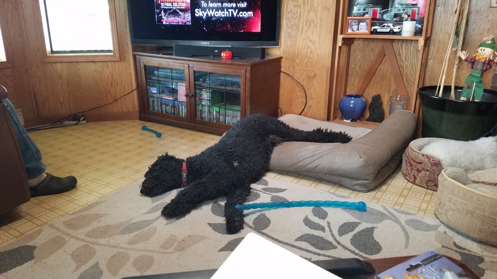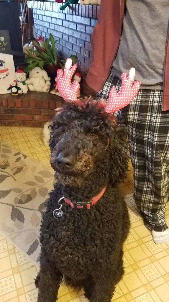 Joey loves his toys, and we have to buy the tough chewer toys so they last a while because he is an enthusiastic player. He’s got the sweetest eyes, is unbelievably gentle with his brothers, and no one has the heart to tell him he’s big, so he’s also a very accomplished lapdog. He’s been formally diagnosed with ADHD by two different vets, and is the spoiled baby of the pack as the youngest. I get lots of weird looks when I say his “big brothers” occasionally bully him, because they are 2 and 4 pound poodles.