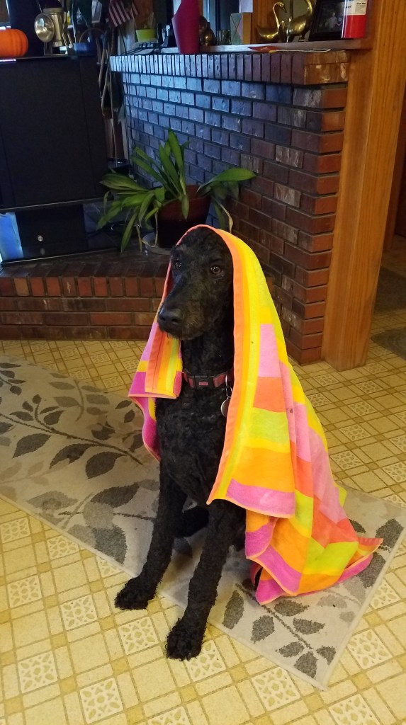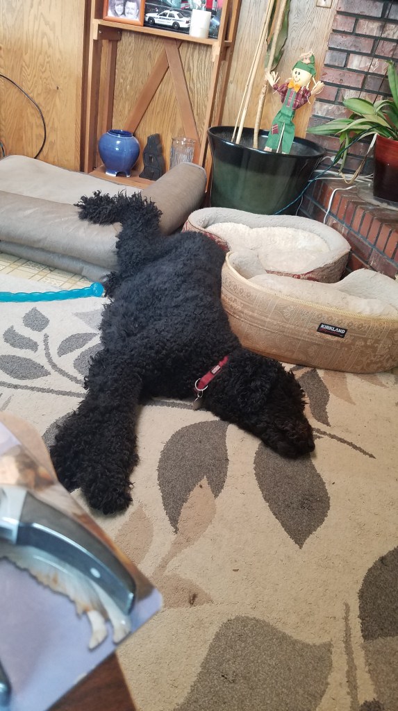 Joe Friday, more commonly known as Joe-Joe around here, is a 90lb, almost 4 foot tall poodle. He made my aunt’s great dane look normal. His head rests on my kitchen counters. Poodles don’t generally get that big, and he’s actually purebred and papered so I know he’s a poodle (it was a friend of a friend situation, how Joey came into our lives), but we forgot to tell him to stop growing. When he was a pup, he ate a large river stone, and on top of a pretty intense surgery, spend some of his formative months wearing a muzzle… because I continued to have to pull rocks out of his mouth all of the time! It took forever for him to grow out of that and I spent so much on tests and treats to make sure he wasn’t looking for nutrients or something… nope, just liked eating rocks.
