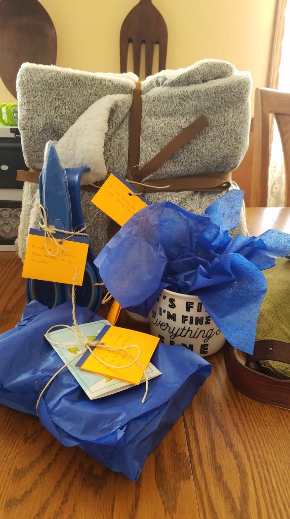 Speaking of cute mugs, I found an adorable little mug that says “it’s fine, I’m fine, everything’s fine” at our local department store that I’m sending to a friend (although admittedly, if they still have it next time I’m in there, I might pick up one for me, since that’s one of my go-to phrases). She is going through a rough spot life wise, and I thought she might need a bit of a care package. I picked up the mug, a nice blanket, a couple of my favorite little kitchen things since she’s moving and somewhat starting over (a spoon rest and some magnetic scissors, both have been invaluable in my kitchen), and finally a good dose of the artisan chocolates my little town is known for. Got everything wrapped up with little inside jokes, a little card, and some protective tissue paper, and it’s now on its way to the coast. I hope she likes it.