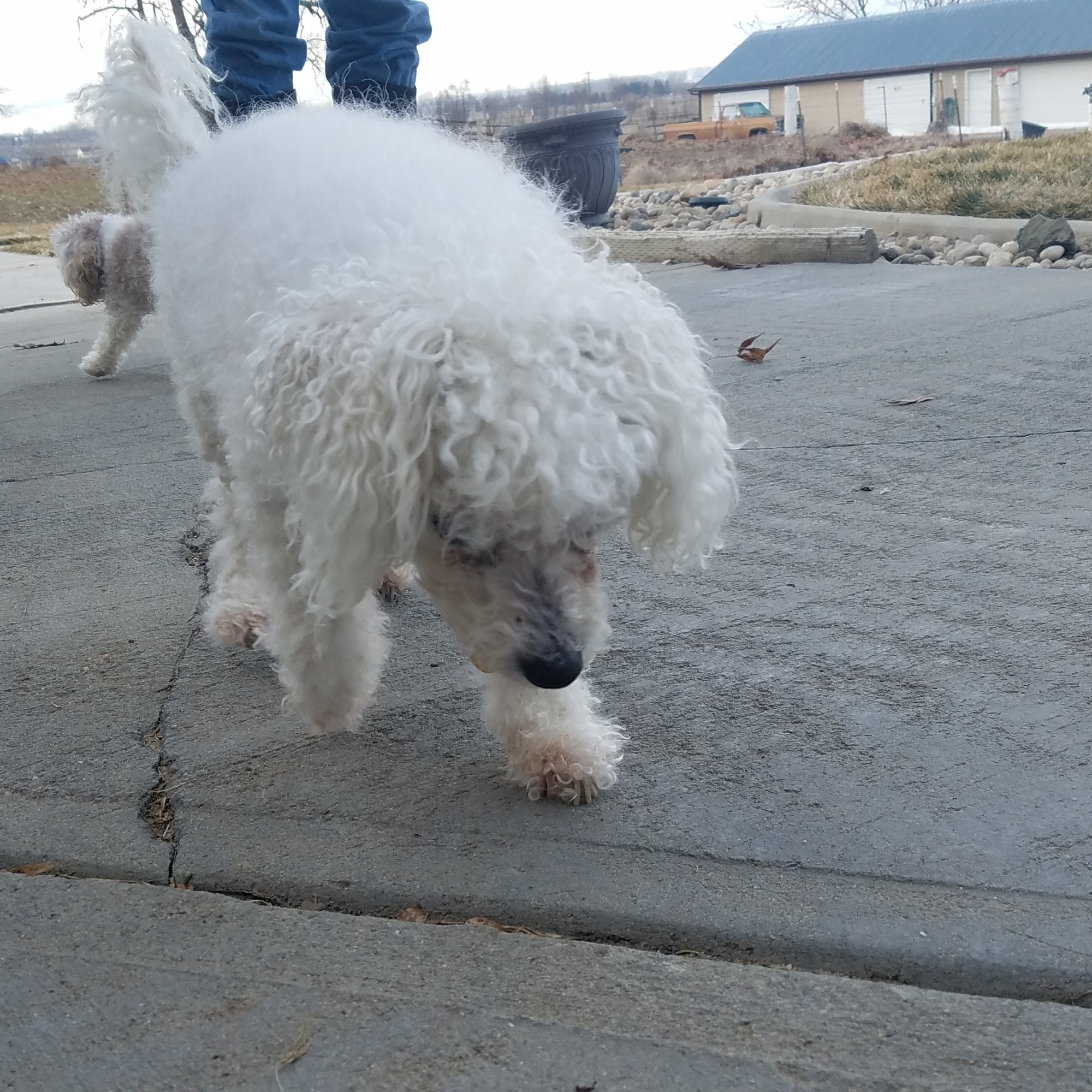 An update on Scooby now that he’s had some time to adjust to being a visually impaired pupper. He’s mastered most of his usual routes, and the four steps on the porch. He’s gotten weirdly comfortable with just walking over the top of, or through the legs of, Joe instead of going around. For Joe’s part, he’s gotten very good at standing or laying very, very still while Scooby goes about his travels. He’s pretty patient. He also goes out after Scoobs if he gets too far out in the yard or too close to the retaining wall.