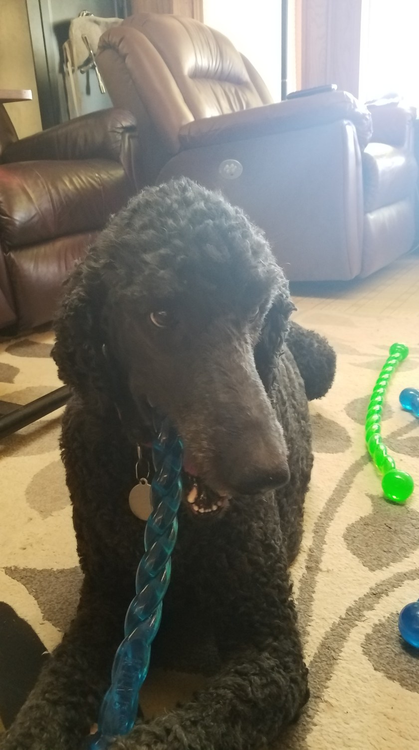 After he’s taken his new Stix, one by one from the box, around the house to show everybody, and finally over to the living room (the most wide open space and thus the best for playing), I get a happy dog tackle hug. Without fail, he hugs and cuddled until I relent, and we are sitting on the floor while he chews, shows off, and inspect the new toys. Sometimes he will hand his Stix off to me or anyone else who’s joined us on the floor so we can play too. But pretty soon he’ll need it back for chewing purposes.