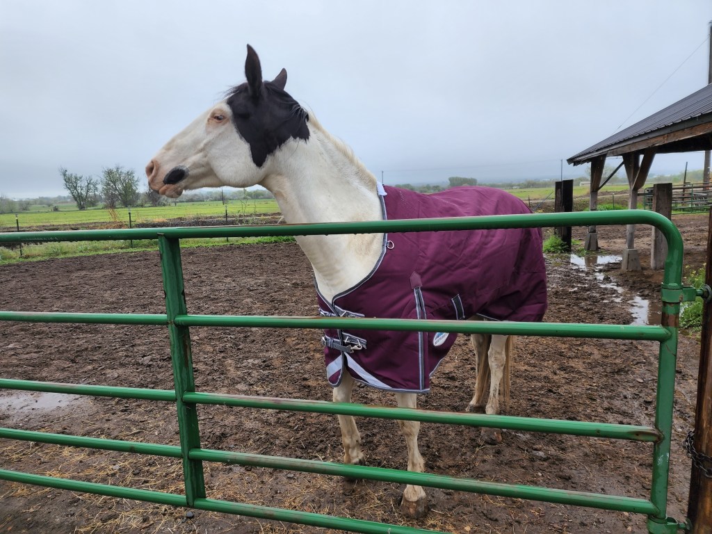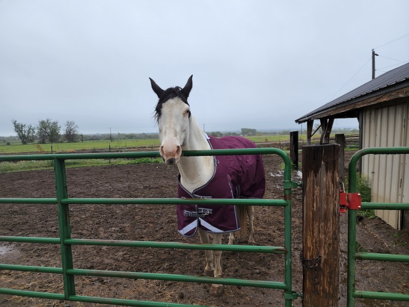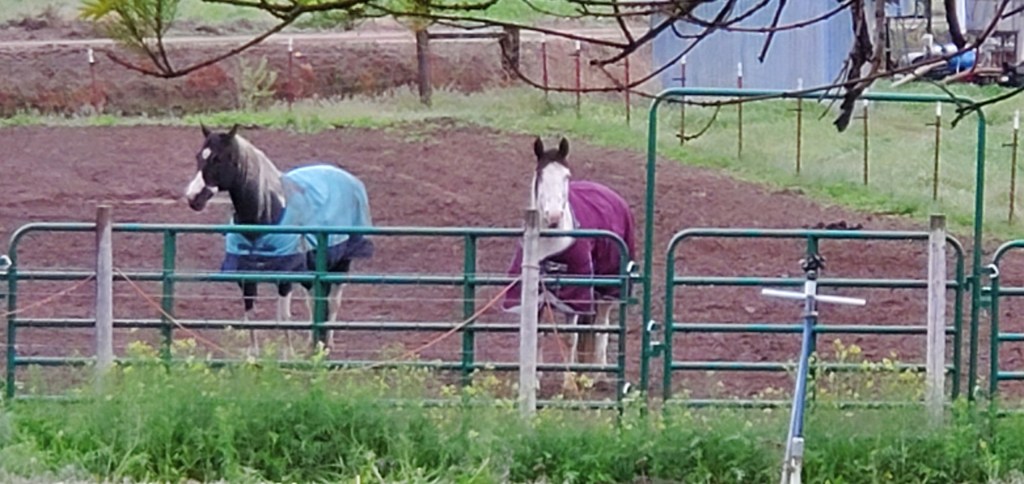 In today’s episode of “I sure wish someone would treat me like I treat my horses”, Nellie and Ro-Ro are out sunning themselves under what is becoming an increasingly rare sunny day, after spending the night and early morning all snuggled up in fluffy warm blankets due to the rain. They are also relaxing after yesterday’s very long day of having their hooves trimmed and conditioned and getting a chiropractic adjustment to address stiffness and any lingering winter creaks and moans.