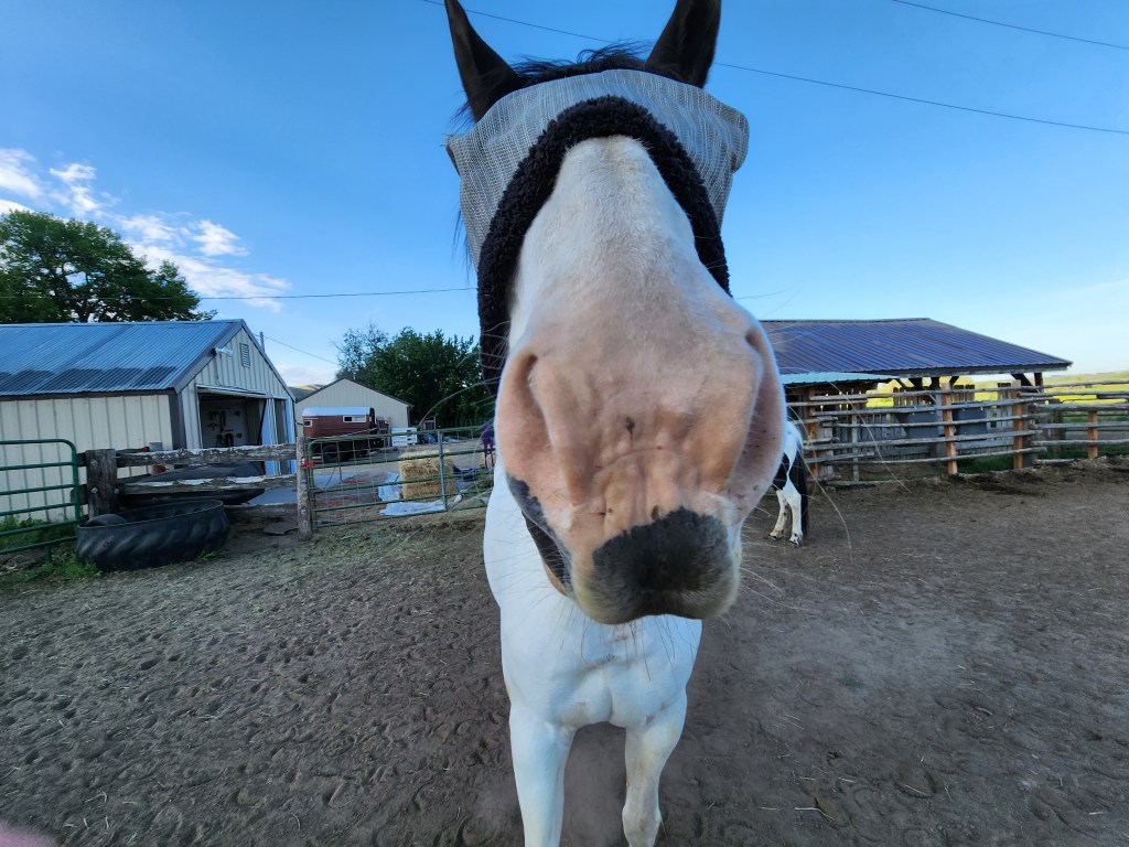 As I am sure you noticed in the video snippets, Nellie is starting to wear her fly mask! It’s slow going, and we’ve had some setbacks, including a couple injuries to yours truly, but she’s slowly understanding that this is a part of life. She doesn’t seem to mind the mask, but the putting on and taking off is potential meltdown territory. But I am proud of her for trying, and she does try her little heart out for me. Just a recap, in case this is your first post here (hi!) Nellie needs to start wearing a mask (and probably a fly sheet eventually) as a way to block out the sun because she has a really sensitive patch of skin on her eye that is at risk of melanoma. I want to sunscreen her little pink nose too, but that’s still full on panicking, melting down, losing faith in the human race territory for that little mare, so baby steps. Oh the joys of taking on an abused pony, excuse me whilst I go rant at a family member about all the things I would do to Nellie’s previous owners if I ever got my hands on them.